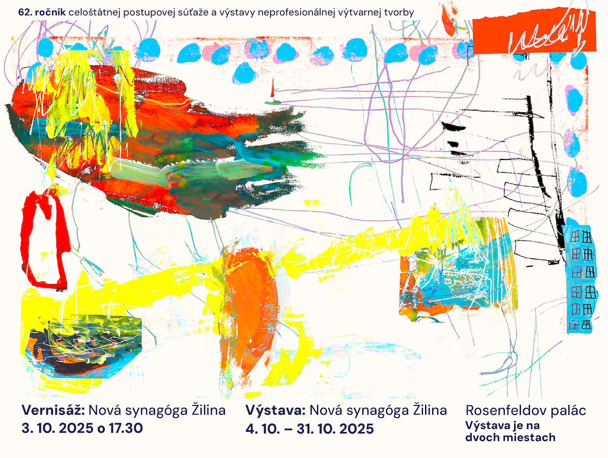 Výstavu v Novej synagóge a Rosenfeldovom paláci nájdete otvorenú od 3. do 31. októbra. Mimoriadne meníme aj otváracie hodiny - sme tu každý deň vrátane pondelka od 11.00 do 19.00 (v Rosenfeldovom paláci len do 16.00). Paralelne k výstave prebiehajú sólo výstavy Depeše Martiny Chudej v Makovického dome a víťazky Open callu Výtvarné spektrum Alice Záhorskej Puška chladí v suteréne Novej synagógy. Vstup na všetky výstavy je (dobro)voľný.- - -Prečo sme sa rozhodli hostiť salón amatérov a amatériek, hoci sme sa doteraz neprofesionálnemu umeniu vyhýbali? V prvom rade bolo výzvou zadanie - ako spraviť z obrovského súboru nesúrodých umeleckých diel (hoci kvalitných a zaujímavých) dobrú výstavu? Ako neinštalovať jeden obraz vedľa druhého, ako dielam pomôcť a vytvoriť im prostredie, v ktorom budú vedieť fungovať, ako zaujať a neunudiť návštevníka? Ako to celé zvládnuť s minimálnym rozpočtom a s využitím recyklovaného materiálu? Rovnako sme sa nadchli pre spoluprácu medzi inštitúciami, ktoré nás oslovili. Hoci je Rosenfeldov palác oproti Synagóge cez cestu, nikdy sme nehostili spoločnú výstavu. Hoci sme kedysi začínali ako študenti-amatéri v Makovického dome, nikdy sme poriadne s Krajským kultúrnym strediskom nič nerobili. Podarilo sa nám to? Príďte sa presvedčiť na vlastné oči. Fotoreport z otvorenia 3. 10. 2025 nájdete na našom Flickri https://flic.kr/s/aHBqjCwtRQ“Ťažko nájsť jednotný lajtmotív, a preto vzťahy medzi obrazmi a objektami v rámci adjustácie vznikali skôr asociatívne. Diela zobrazujú krajiny, portréty a figurálne kompozície, mestské scenérie, ponory do prežívania, nálad a emócií jednotlivcov i širšej spoločnosti. Prítomná je tu ťaživosť súčasnosti, ktorá sa prejavuje v motívoch, farebnosti alebo celkovej atmosfére zobrazení, no i snaha tejto ťaživosti uniknúť prostredníctvom vízií budúcnosti, humoru, zveličenia, irónie, vytvárania ilúzie a hry s obsahom, materiálom i perspektívami. Kľúčovým momentom sa teda pri budovaní výstavy stal skôr celkový dojem, textúry, farebnosť a expresivita. Vo výstave funguje zvolená subjektívna naratívna linka, ktorá má snahu udržať diela v kontexte súčasnej výpovede o našom svete. V rámci architektúry výstavy sa tu objavuje zjednocujúca línia v použití recyklovaných odpadových materiálov prechádzajúcich všetkými priestormi. Celková expozícia vo svojej ideovej i fyzickej rovine vytvára skôr mozaiku materiálov a textúr, ktoré sa prevrstvili s fragmentmi reality. Tie zastupujú jednotlivé umelecké pohľady a stanoviská nachádzajúce sa v rozmanitosti spektra.” (z textu kurátorky Marianny Brinzovej)- - - Výtvarné spektrum je postupová súťaž pre výtvarníkov a výtvarníčky, ktorí neštudovali umenie na VŠVU, AU, AVU či iných podobných vysokých školách. Skrátka pre amatérov, neprofesionálov. Súťaž organizujú “osvety” - regionálne kultúrne strediská a celoštátne ju zastrešuje NOCka - Národné osvetové centrum. Do 62. ročníka bolo prihlásených spolu 335 diel od 211 autorov z celého Slovenska. Postúpili regionálnymi a potom ôsmimi krajskými kolami súťaže až k odbornej porote, ktorá hodnotila:z Košického kraja – 56 dielz Nitrianskeho kraja – 51 dielzo Žilinského kraja – 51 dielz Prešovského kraja – 42 dielz Bratislavského kraja – 37 dielz Trnavského kraja – 35 dielz Banskobystrického kraja – 33 dielz Trenčianskeho kraja – 29 dielNakoniec z nich porota vybrala 197 diel od 135 autorov, ktoré nájdete na finálovej výstave. Hostíme ju na mesiac v Žiline spolu s Rosenfeldovým palácom a Krajským kultúrnym strediskom. Na výstave spoznáte aj víťazov a ocenené diela (kompletný zoznam autorov a autoriek aj ocenených diel je nižšie). Výstava celoštátnej postupovej súťaže neprofesionálnej výtvarnej tvorby Výtvarné spektrum 2025: predsedníčka poroty Eva Čarnokáčlenovia poroty Martina Chudá; Pavol Truben, Miroslav Sandanus a Peter Králikorganizátor súťaže za NOCku Eduard Klenakurátorka výstavy Marianna Brinzováorganizátori a inštalácia výstavy - Petra Rovderová a Matej Somr (Krajské kultúrne stredisko Žilina), David Reitšpís a Palo Choma (Rosenfeldov palác), Marek Adamov, Július Laták a ďalší (Nová synagóga)grafický dizajn Veronika Kurcinová- - -Zoznam ocenení a autorovHlavná cenaPeter Čuchran, Sady nad Torysou, Košický kraj – Anjel v meste II, akryl (Kategória D – INSITNÁ TVORBA)Cena županky ŽSKEdita Sabelová, Staškov, Žilinský kraj – Keď strom rozpráva, mokré a suché plstenie (Kategória 2.C – PLASTIKA)Cena primátora mesta ŽilinaTomáš Mačas, Lutiše, Žilinský kraj – Antúria u starej mamy, olej na plátne (Kategória D – INSITNÁ TVORBA)Cena Registra KubikumMartin Heštera, Prešov, Prešovský kraj - Samota (Kategória 2.C – PLASTIKA)Ocenenia – 1. veková skupina (15 – 25 rokov)Kategória A – MAĽBAOCENENÍSabina Zelinová, Spišské Bystré, Prešovský kraj – Dobrí priatelia, šablónová maľbaZuzana Skybjaková, Poprad, Banskobystrický kraj – 3x Fantómový dotyk, kombinovaná technikaČESTNÉ UZNANIASimona Veresová, Svederník, Žilinský kraj – V metre, maľba akrylomVYSTAVUJÚCIEster Di Tommasová, Humenné, Prešovský kraj – Medzi muškami svetluškami, kombinovaná technikaAdela Ilčíková, Topoľčany, Nitriansky kraj – Kultúra (Slovenská a žiadna iná), akrylová maľba a kolážTerézia Ďurišová, Belá, Žilinský kraj – Melancholy, maľba akrylomSamuel Kvaššay, Považská Bystrica, Trenčiansky kraj – Niečo v tom duchu 1 – stratený duch, perokresba+akvarelSamuel Kvaššay, Považská Bystrica, Trenčiansky kraj – Niečo v tom duchu 2 – duch stromový a duch myšací, perokresba+akvarelNatália Puškášová, Žilina, Žilinský kraj – ÚnikKarin 